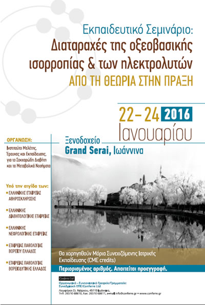 Το Ινστιτούτο Μελέτης, Έρευνας και Εκπαίδευσης για το Σακχαρώδη Διαβήτη και τα Μεταβολικά Νοσήματα διοργανώνει Εκπαιδευτικό Σεμινάριο με θέμα «Διαταραχές της Οξεοβασικής Ισορροπίας και των Ηλεκτρολυτών: από τη Θεωρία στην Πράξη» που θα πραγματοποιηθεί στις 22-24 Ιανουαρίου, 2016, στο Ξενοδοχείο Grand Serai, Ιωάννινα.