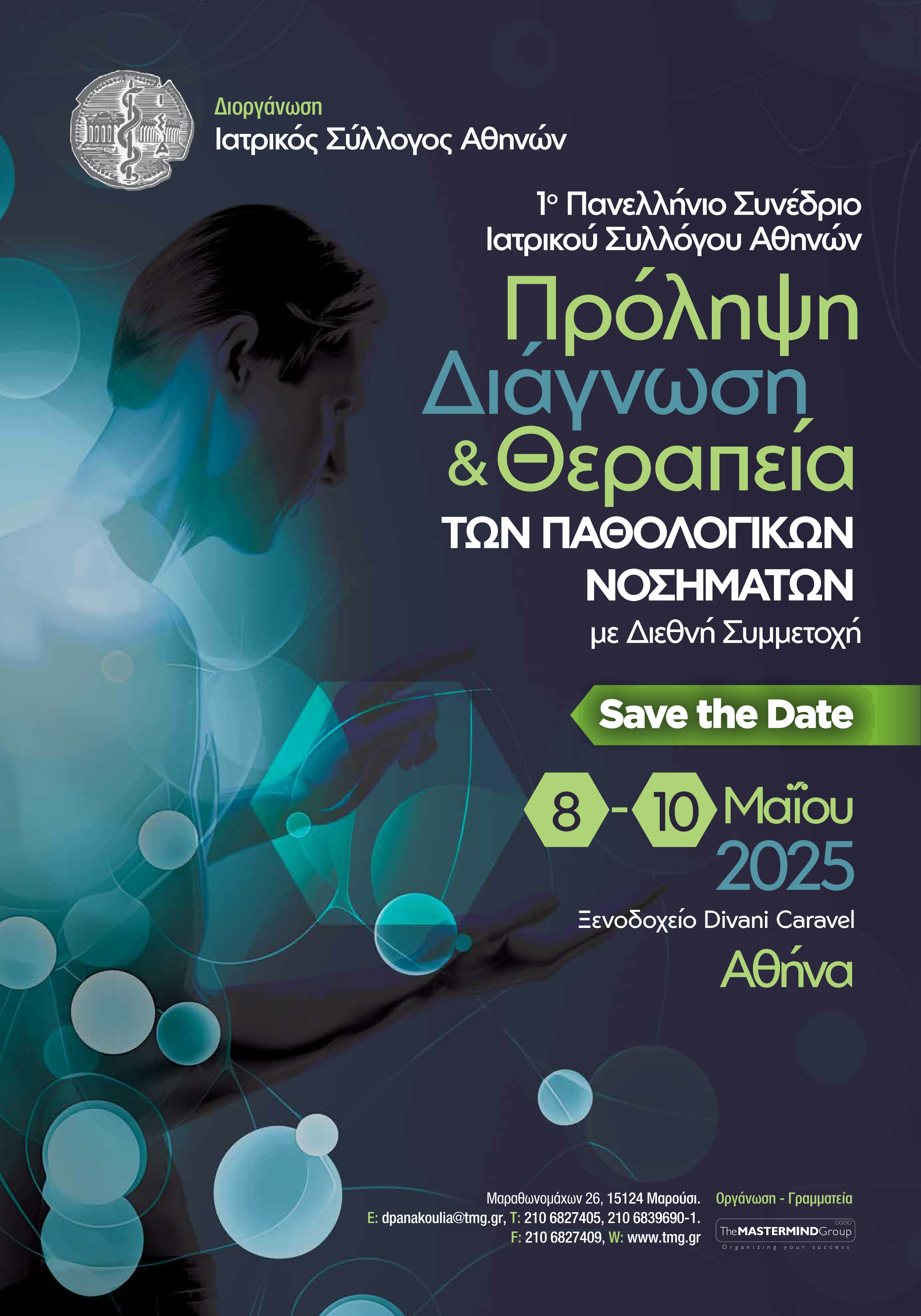 SAVE THE DATE: 1ο Πανελλήνιο Συνέδριο Ιατρικού Συλλόγου Αθηνών , 08-10 Mαΐου 2025, Ξενοδοχείο Divani Caravel, Αθήνα